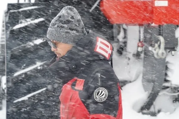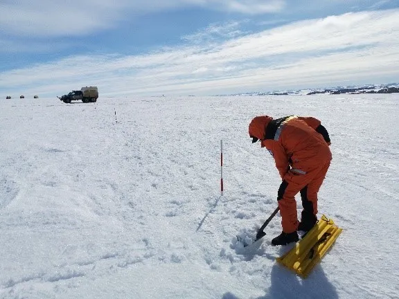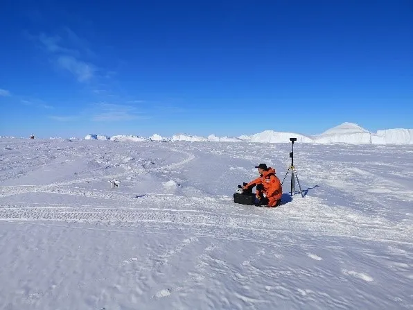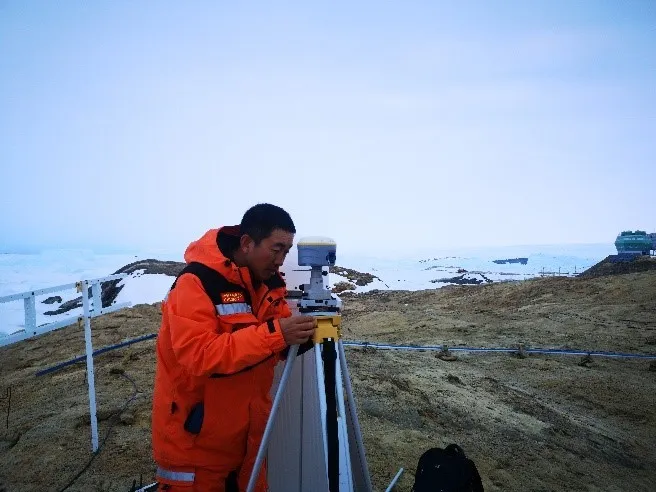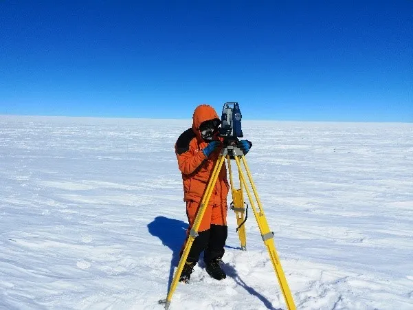 (乔刚老师使用GPS、全站仪在冰盖进行测绘工作)